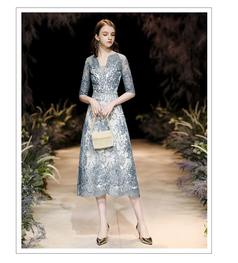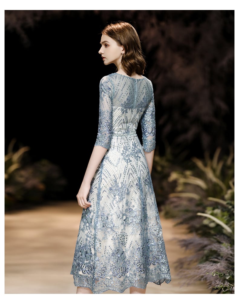 パーティードレス 5分袖 スクエアネックブラックミディ丈ドレス