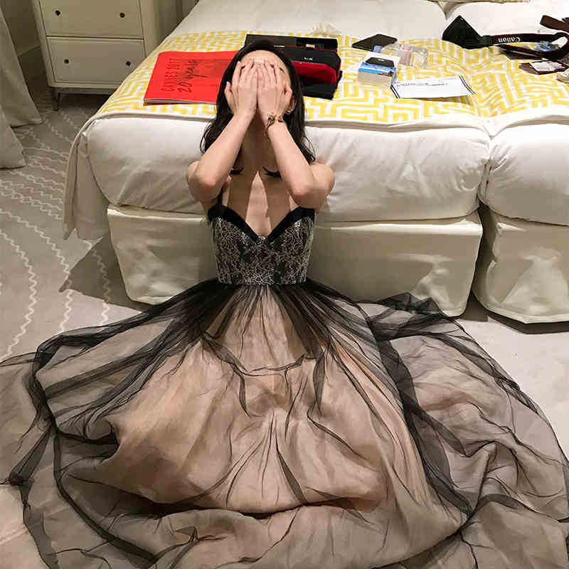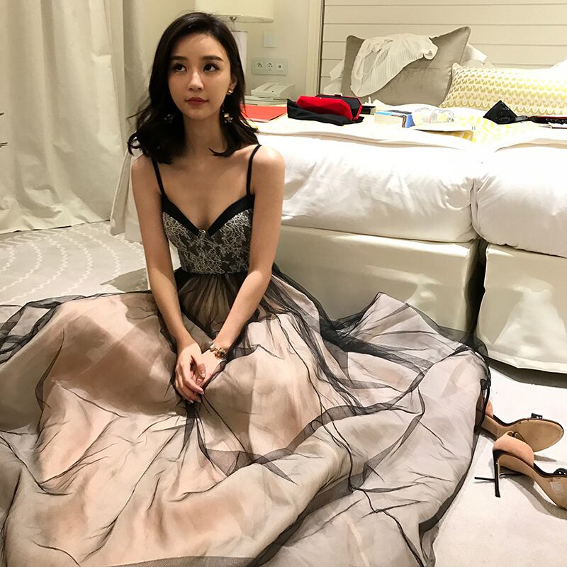 異素材組み合わせ☆エレガントシースルーレース黒色ロングドレス