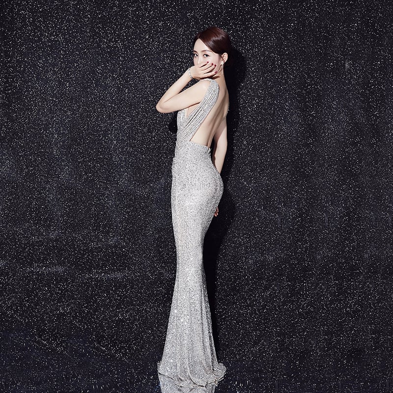 キラキラ☆スパンコール装飾Vネック フェザー調ロングスカート パーティードレス GR003