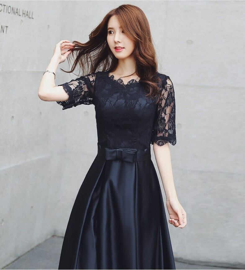 異素材組み合わせ☆エレガントシースルーレース黒色ロングドレス